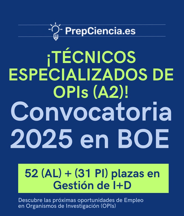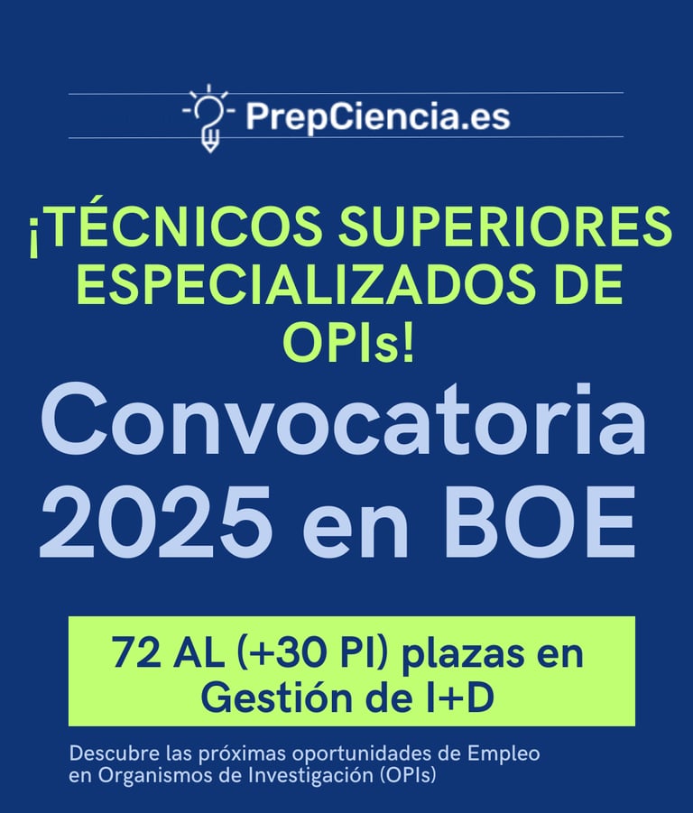 Los Organismos Públicos de Investigación (OPIs) son entidades que dependen de la Administración General del Estado y cuya misión principal es llevar a cabo actividades de investigación científica, desarrollo e innovación. Los OPIs cuentan con equipos multidisciplinarios que trabajan en proyectos de alto impacto en áreas como la biomedicina, la energía, las ciencias sociales, la tecnología y más. Algunos de los OPIs más conocidos en España son el CSIC (Consejo Superior de Investigaciones Científicas), el IAC (Instituto de Astrofísica de Canarias), el INTA (Instituto Nacional de Técnica Aeroespacial "Esteban Terradas"), el ISCIII (Instituto de Salud CArlos III) y el CIEMAT (Centro de Investigaciones Energéticas, Medioambientales y Tecnológicas). Además, con estas oposiciones también podrás obtener plaza en la AEI (Agencia Estatal de Investigación), organismo financiador de la investigación.